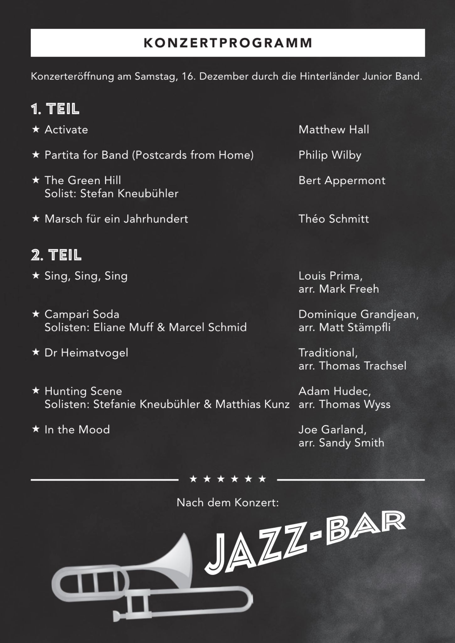 Unter der Leitung von Roger Müller wird nach einem fulminanten Eröffnungsstück und einem Konzertstück Stefan Kneubühler als Solist auf dem Euphonium eine wunderbare irische Melodie spielen. Abgeschlossen wird der erste Teil mit dem Schweizer «Marsch für ein Jahrhundert». Nach der Pause folgt ein toller und äusserst unterhaltsamer zweiter Teil mit Schweizer Musik und Jazz. Neben dem bekannten Lied «Campari Soda» von Stephan Eicher (Solisten: Eliane Muff und Marcel Schmid), werden die beiden Cornet-Solisten Stefanie Kneubühler und Matthias Kunz mit «Hunting Scene» auf die Jagd gehen. Neben dem ruhigen wunderschönen Schweizerlied «Der Heimatvogel» wird die Fridli-Buecher-Halle mit «Sing, Sing, Sing» und dem weltbekannten Hit «In the Mood» zum Schluss des Konzertes zur Jazzhalle. Durch den Abend wird Martina Stutz führen. Am Samstagabend wird die Hinterländer Junior Band das Konzert eröffnen.