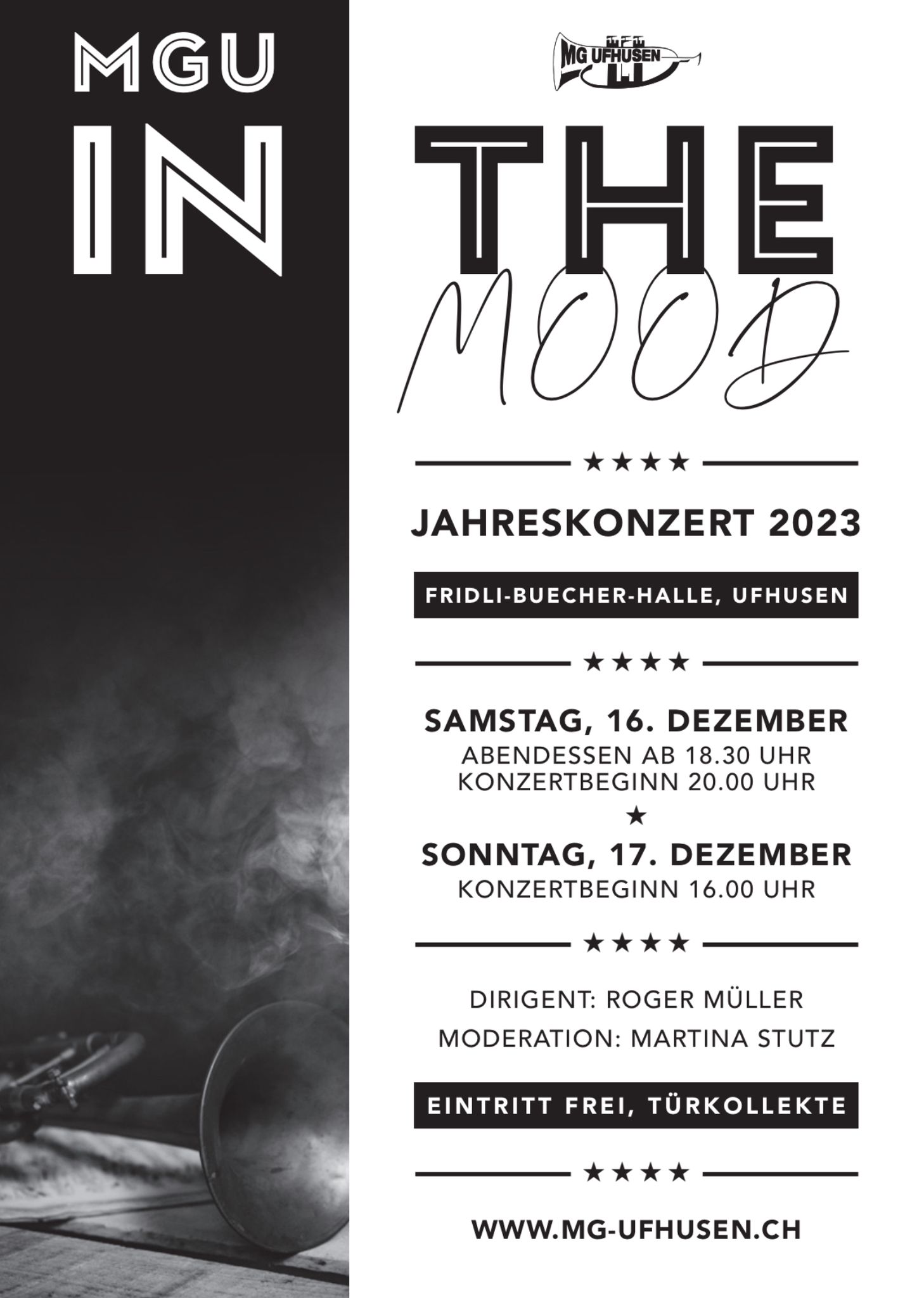 Die Musikgesellschaft Ufhusen lädt die Bevölkerung, Freunde und Bekannte herzlich zum Jahreskonzert am Samstag, 16. Dezember 2023, 20.00 Uhr und Sonntag, 17. Dezember 2023, 16.00 Uhr in der Fridli-Buecher-Halle ein. Unter dem Motto «MGU in the Mood» oder auf Deutsch «MGU in Stimmung» haben die Musikantinnen und Musikanten ein abwechslungsreiches und stimmiges Programm zusammengestellt.